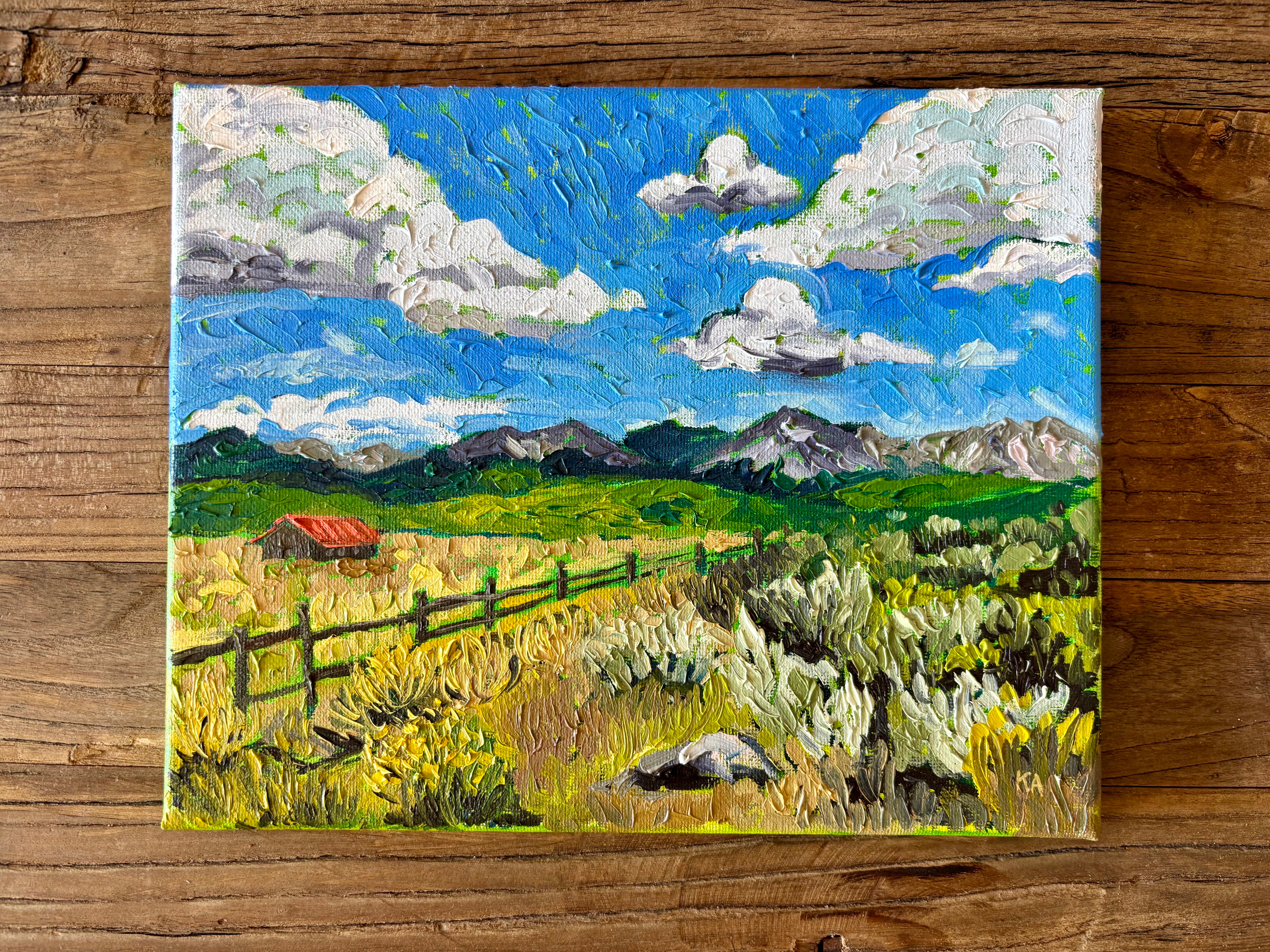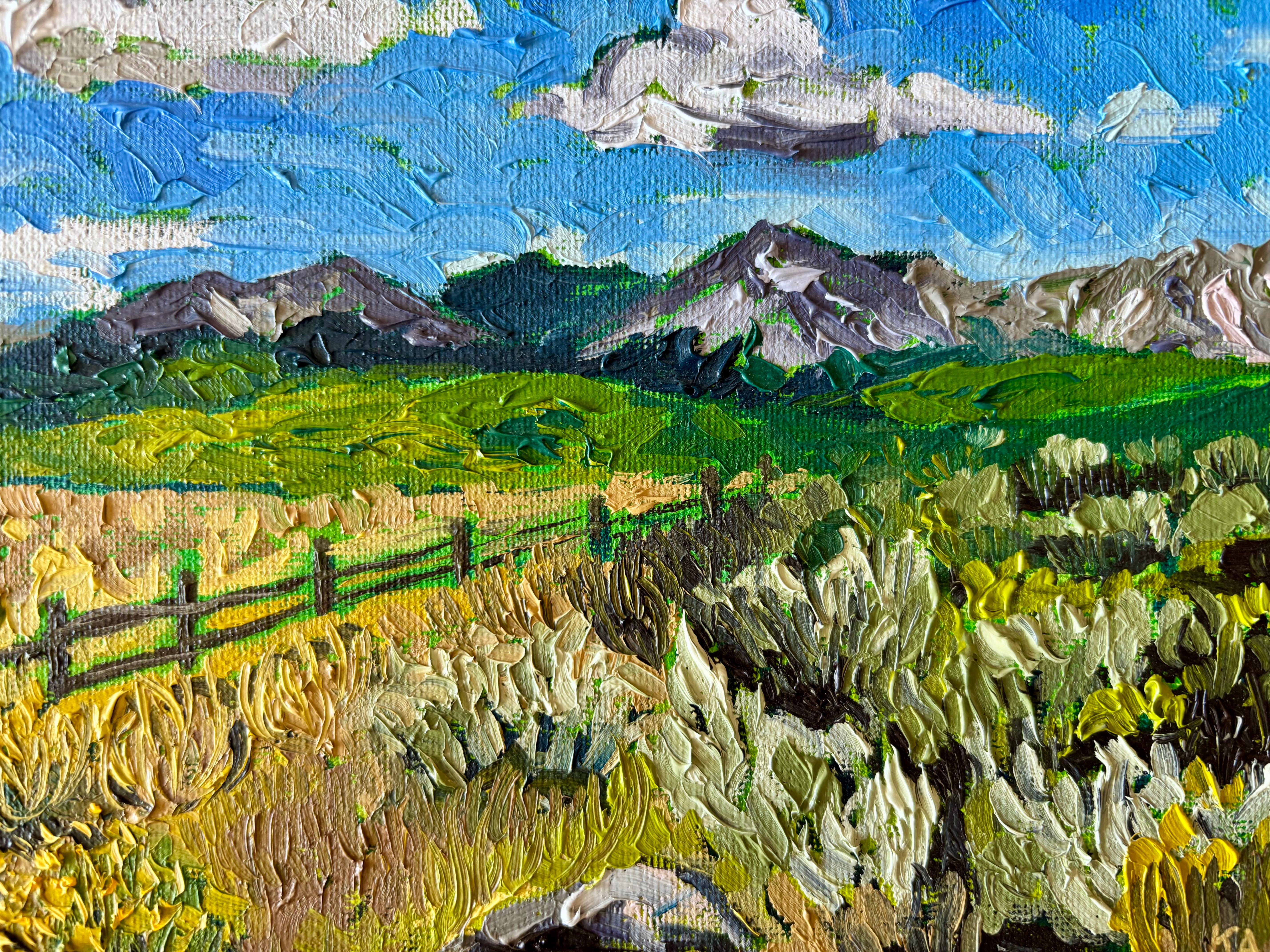 This vibrant oil painting captures the untamed beauty of the American West, where weathered sage and golden grasses bow beneath a sky alive with movement. Thick, sculptural brushstrokes of brilliant cerulean and cobalt blues swirl overhead, while luminous clouds drift across the vast expanse. Distant mountains rise in layered ridges of purple and sage, anchoring the composition with quiet majesty. The impasto technique creates tactile surfaces that shift in changing light, evoking the fleeting magic of golden hour illuminating open country.