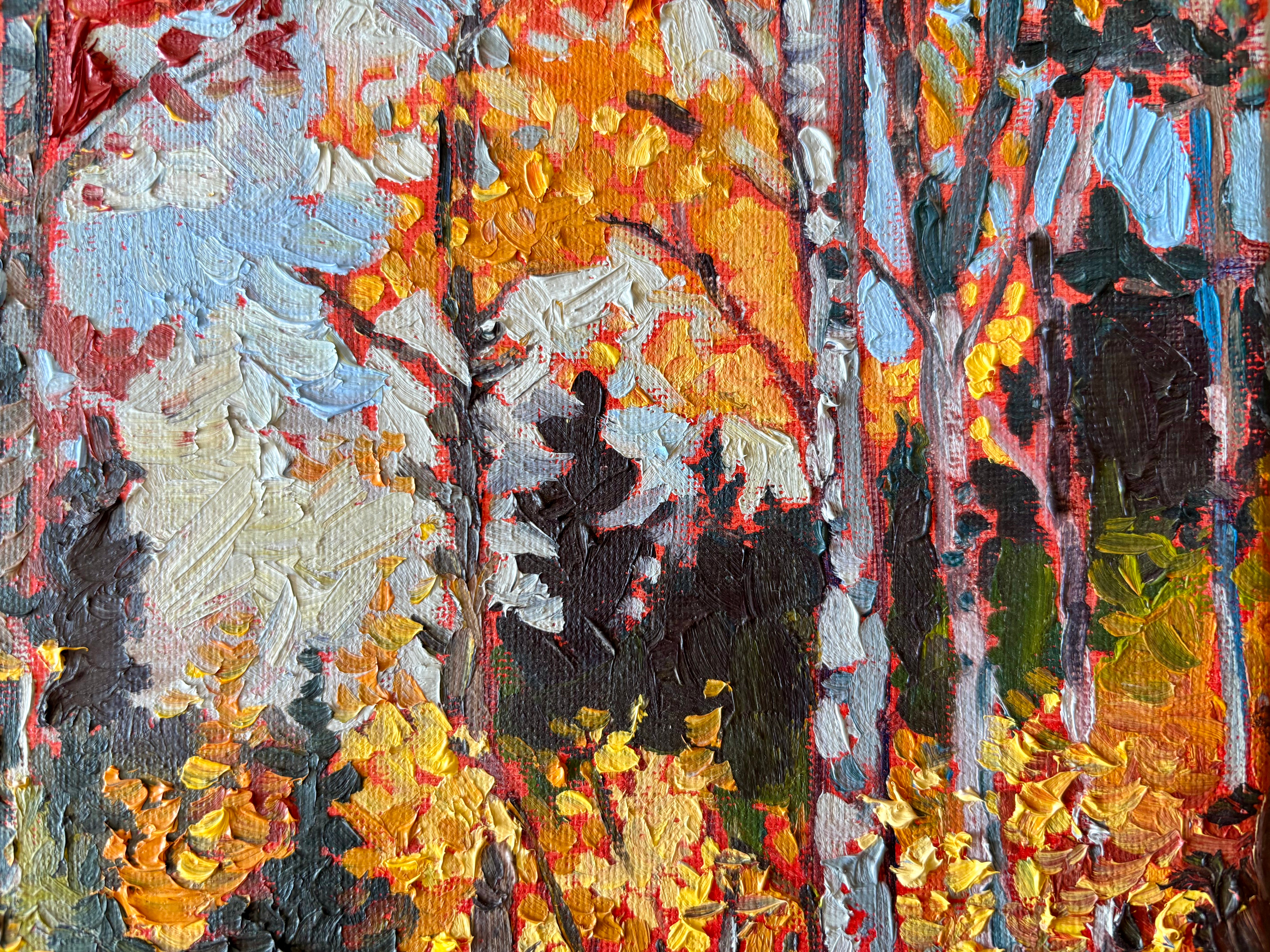 This vibrant oil painting immerses viewers in the fiery spectacle of autumn along Peak's Trail in Breckenridge, Colorado, where aspen trees ignite in their most brilliant display. Slender white trunks rise vertically through the composition, creating a rhythmic forest corridor ablaze with fall color. The canopy overhead burns with incandescent warmth, while layers of golden foliage glow against the pale sky beyond. Bold, expressive brushwork captures the energy and movement of the forest. This work celebrates the fleeting intensity of autumn in the Rockies, inviting viewers into a golden moment when nature reaches its most radiant peak.