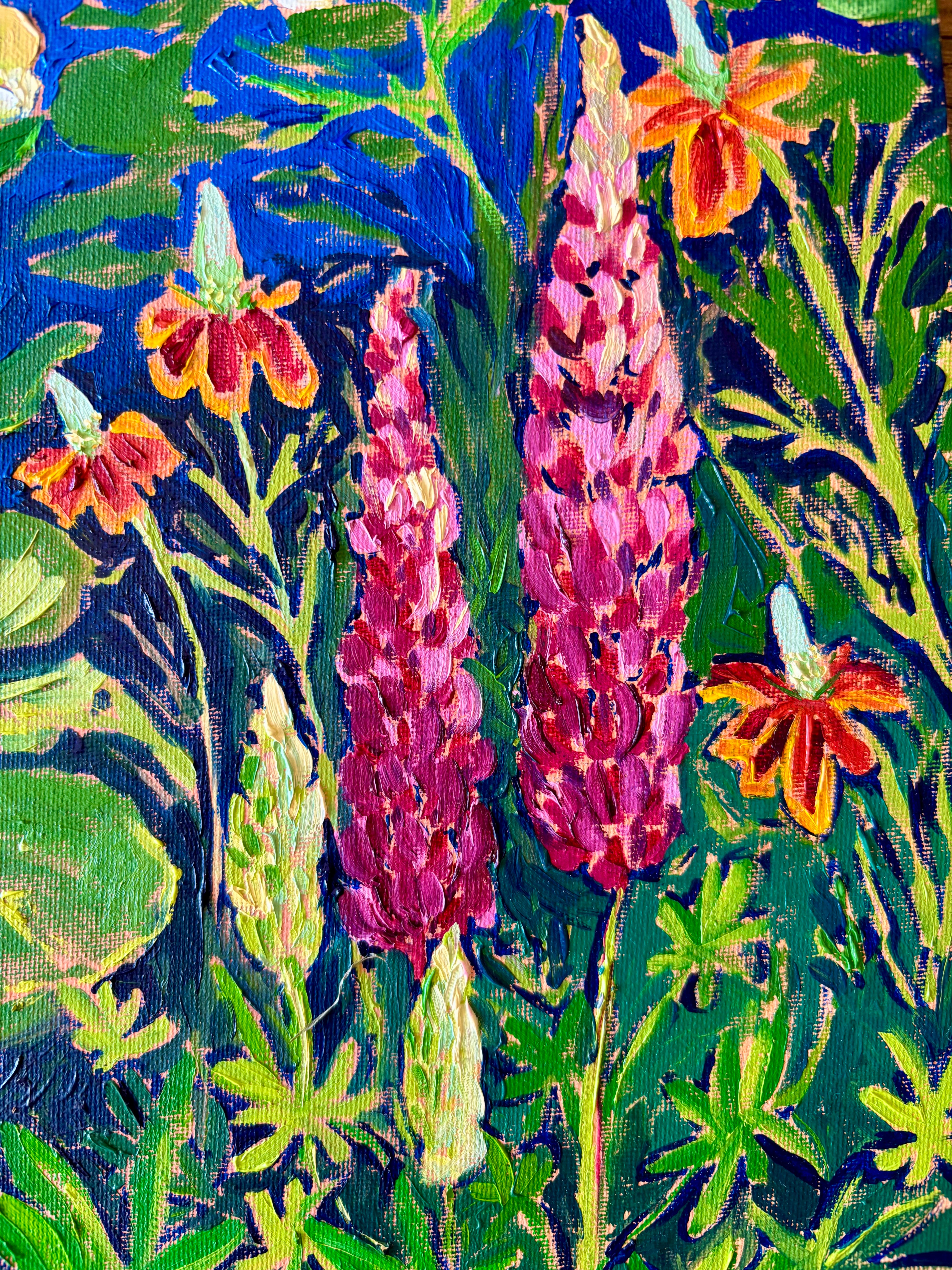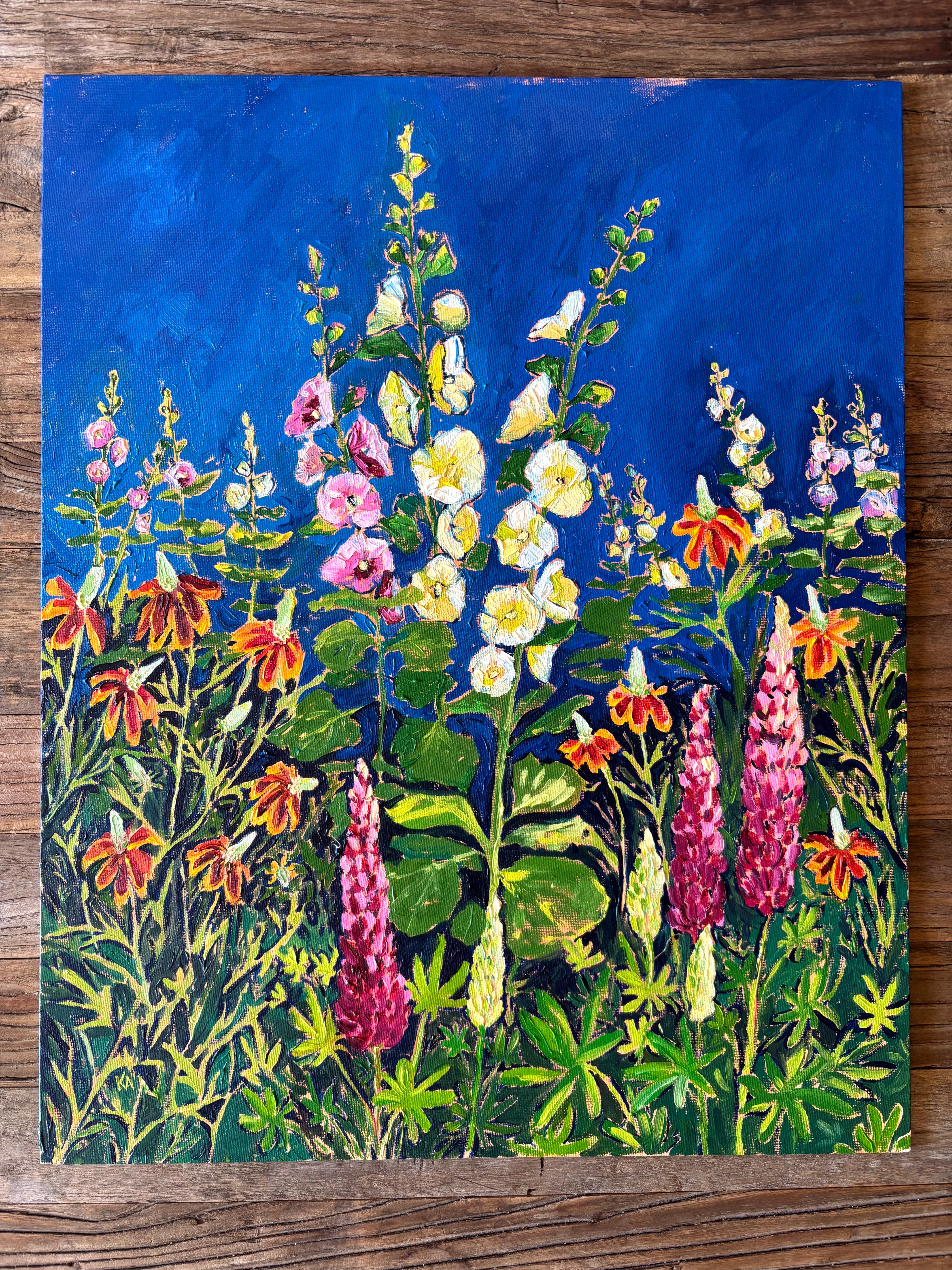This enchanting oil painting captures a moonlit cottage garden in full summer splendor, where hollyhocks, lupines, and prairie coneflowers mingle against a deep cobalt sky. Tall hollyhock spires reach skyward, their petals glowing as if lit from within, while stately lupines add vertical rhythm. Cheerful prairie coneflowers punctuate the composition with their distinctive drooping petals. The rich blue background envelops the scene in nocturnal mystery, transforming familiar blooms into something magical. Bold impasto technique brings tactile dimension to every element, capturing the romance of flowers bathed in moonlight.