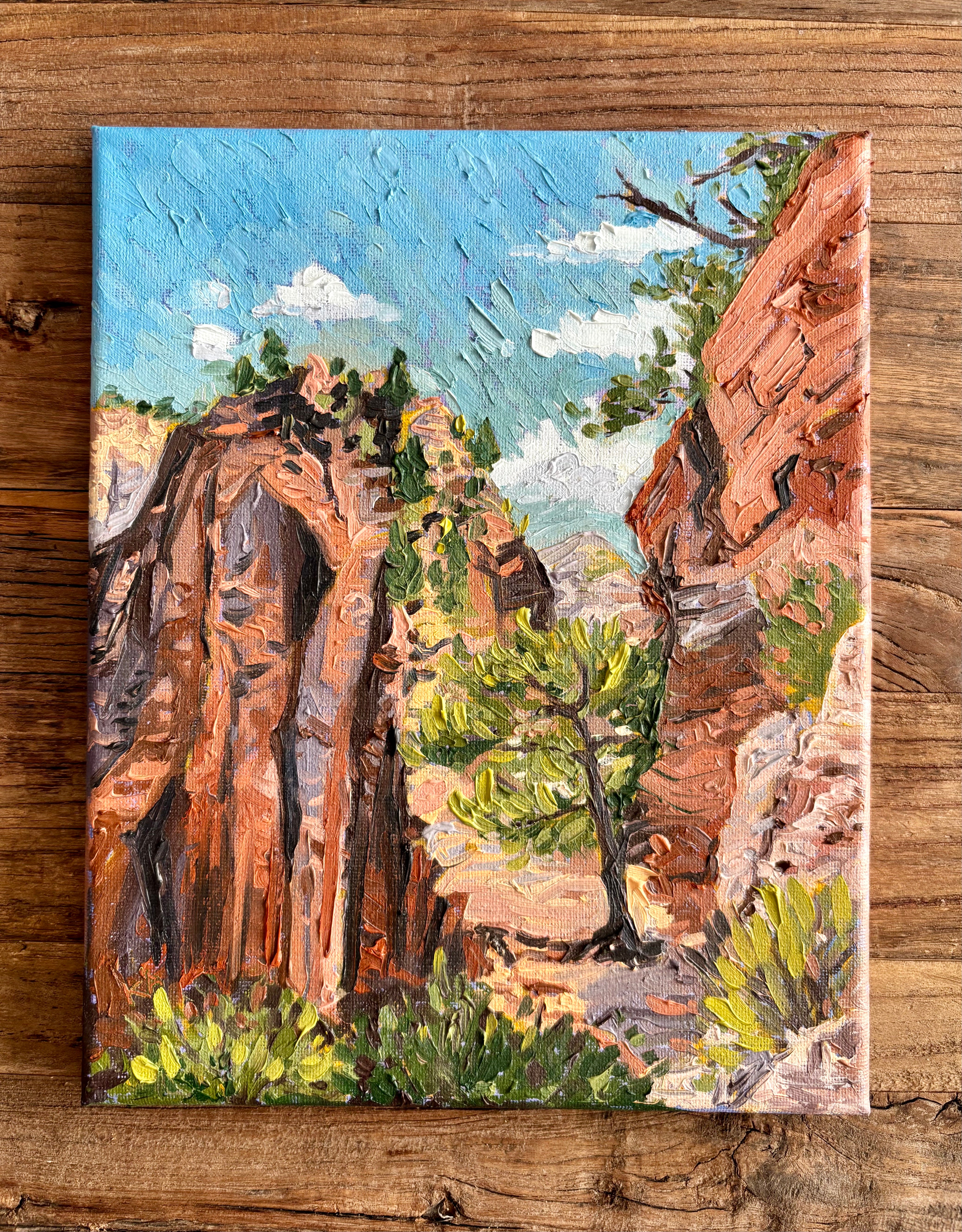 This dramatic oil painting captures the vertiginous beauty of Angel's Landing Trail in Zion National Park, where ancient sandstone cliffs rise in towering majesty against a brilliant sky. The composition plunges viewers into the heart of the canyon, with massive rock formations rendered in rich earth tones. Sheer cliff faces drop away on either side, their striated surfaces catching light and shadow in bold, sculptural strokes. Thick impasto technique brings tactile intensity to the rugged surfaces, evoking the raw power and sublime scale of this iconic trail where earth meets sky in one of nature's most breathtaking displays.