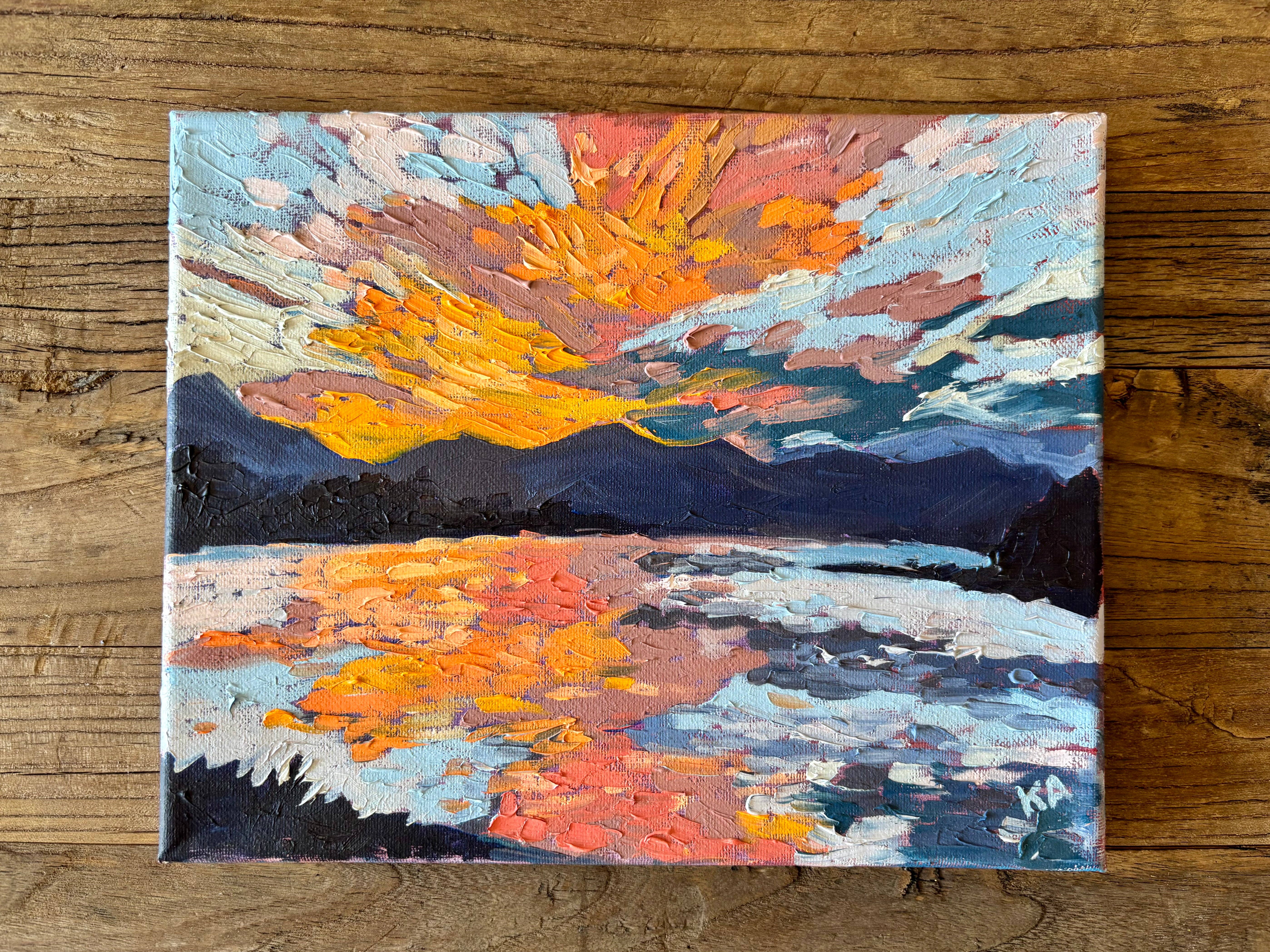 This luminous oil painting captures the breathtaking drama of sunset over Lake Dillon in Summit County, Colorado, where sky and water ignite in radiant splendor. The heavens explode with fiery intensity, brilliant light radiating through layered clouds. Mountain silhouettes rise in dark majesty against this blazing display, Bold, dynamic brushwork captures the fleeting quality of this magical moment, inviting viewers to witness the sublime beauty of a Colorado mountain sunset in all its glory.